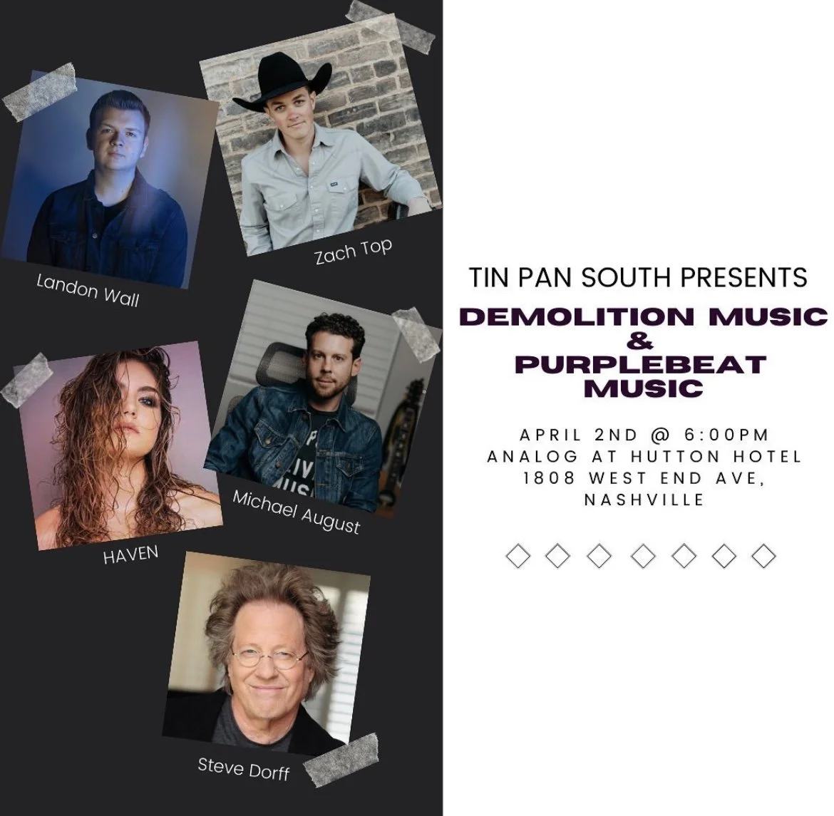 Tin Pan South presents Demolition Music & Purple Beat Music at Analog at the Hutton Hotel on April 2nd at 6pm. Happy to share the stage with Purple Beat Music! Hope to see you all there!